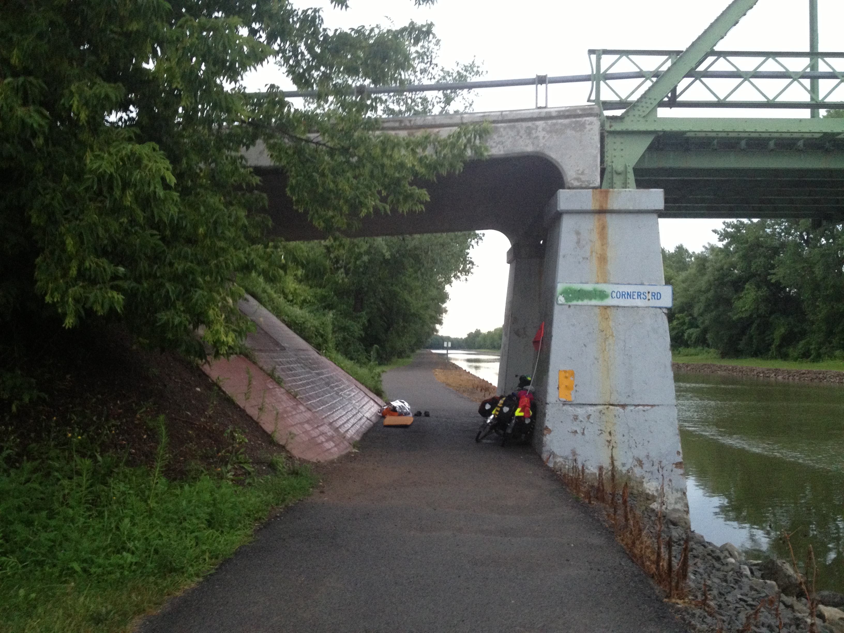 After Buffalo, we biked along the Erie Canal trail and set up camp in a small town’s park pavilion. At about 10:30pm some young cops came and kicked us out. So we slept under this bridge. Only, at 1:30am, the rain storm hit and we got soaking wet, so we really didn’t sleep much at all. Oh yeah, I forgot to mention that I convinced Owen to send the tent home in Chicago because we’d only used it about 3 times. SO! That maybe wasn’t the best idea. In the morning, we just continued onward. Needless to say, I was quite grumpy.