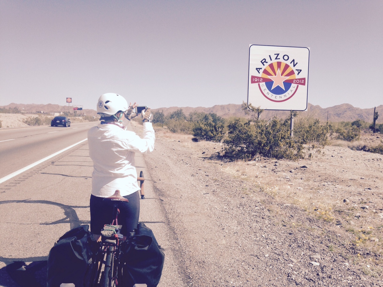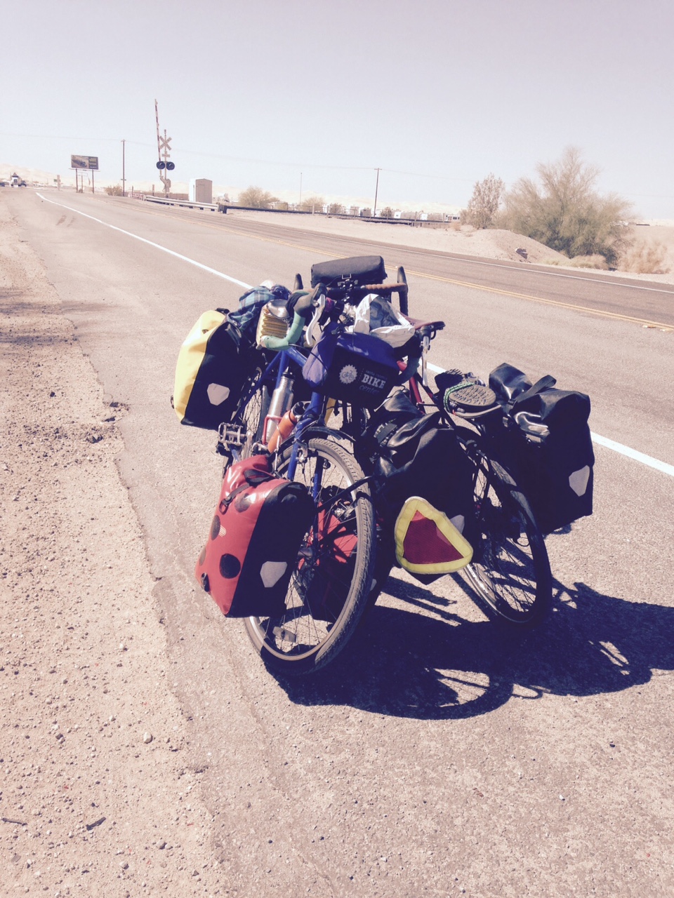 We have succeeded in balancing our bikes together. This is no small feat, as many of you may know from personal experience. This is especially helpful when we get sick of touching our bicycles. Since we have been riding through mostly desert in Arizona, we spend about 9 hours in contact with the steel beasts. We ride 50-70 miles a day, and our biggest climb yet was over 5,000 ft in between Arizona and New Mexico.