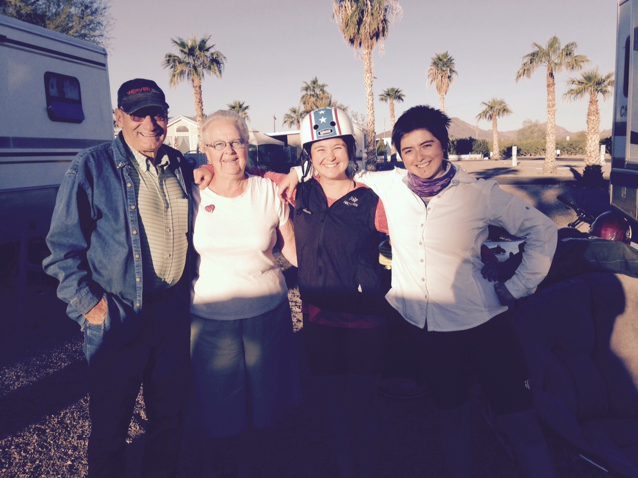 Crossing into Arizona meant starting dry desert days. We were met by many warmshowers hosts who are more than accommodating. We also met Lauren and Karren, two snowbirds from Wisconsin who winter at the Desert Gold RV park in Brenda, AZ. We were standing in front of the only grocery in “town”, met Karren, and within 30 seconds had been offered to sleep on their RV plot. After dinner and discussion, we of course were upgraded to the living room floor and breakfast in the morning. We had a lot to talk about, as a young woman in Karren’s family almost died from TSS a couple of years ago. Another cup giftee, and we are looking forward to exploring the new option for this now tampon-free person.