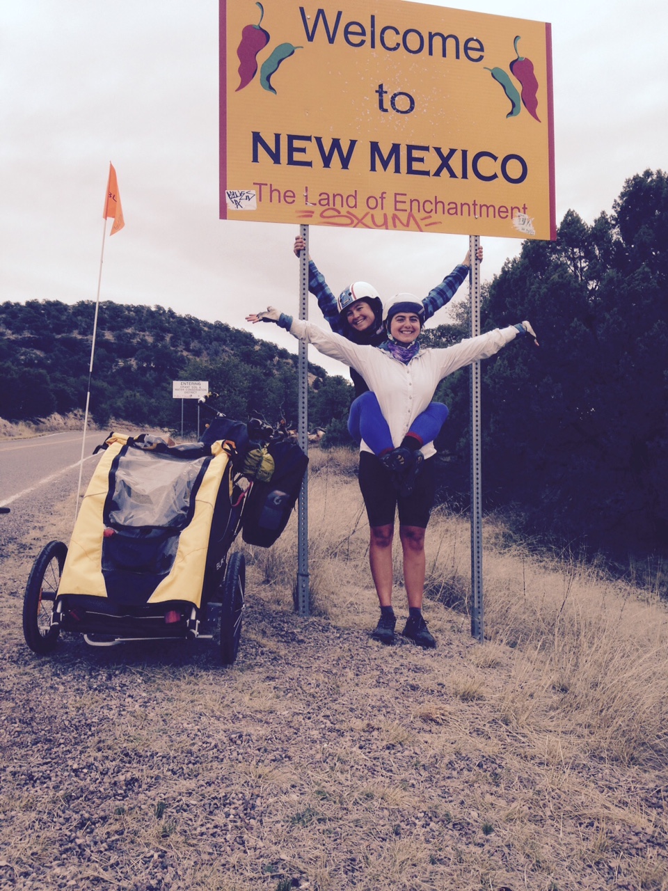 We look so happy to be in New Mexico because we just biked over 5,000 ft to get here. The bike trailer next to us belongs to Josh, a Oregon man who’s toting Shoeless Joe Jackson, a beautiful dog who runs upwards of 40 miles alongside his pedaling dad.